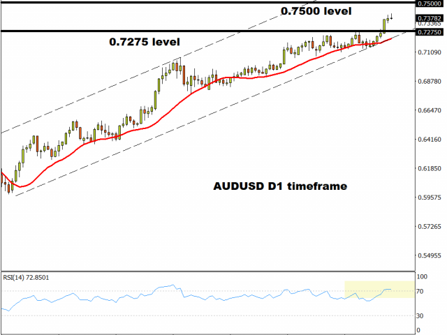 After breaking higher on Friday and closing the week strongly, there are high hopes of pushing prices up towards 0.75. However, prices are overbought now and a pause for breath is healthy after the one-way buying traffic since March. A move below the recent cycle high at 0.7275 negates the break higher.