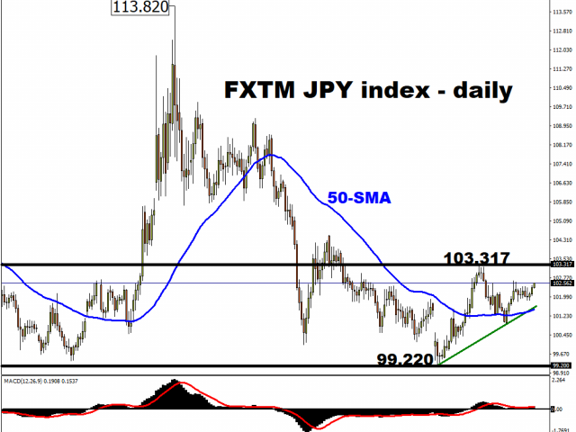 A rising tide of risk aversion over the coming weeks could see the FXTM JPY index breaking above the 103.317 mark for the first time since June, with a higher high adding further confirmation to its uptrend.