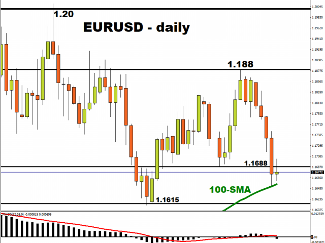 The 100-day moving average in EURUSD is acting as support at the moment with the world’s most heavily traded currency pair bouncing off yesterday’s low. The weekly close will be important to see if prices can hold below 1.1688 and break previous weekly support over the last few weeks. There looks like little support until 1.1615 after this.