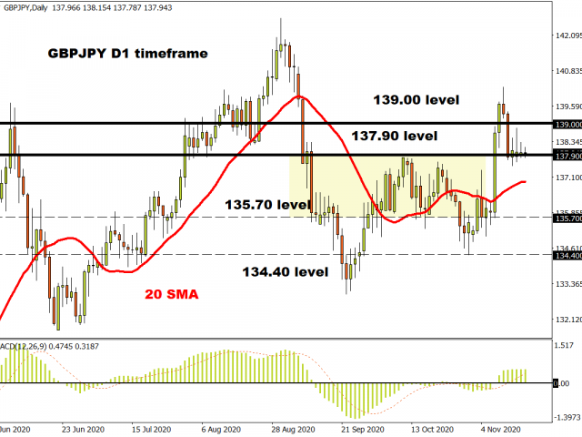 The title says it all. Prices remain trapped around the 137.90 regions. However, lagging indicators such as the MACD and 20 simple moving average pointing to further upside. Should 137.90 become the new higher low, the GBPJPY could rebound towards 139.00 and beyond. Alternatively, weakness under 137.90 is likely to trigger a selloff towards 136.50.