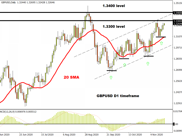 The GBPUSD is bullish on the daily timeframe. There have been consistently higher highs and higher lows while the MACD trades to the upside. Pound bulls are eyeing the 1.3300 resistance level. A breakout above this point could open the path towards 1.3400.