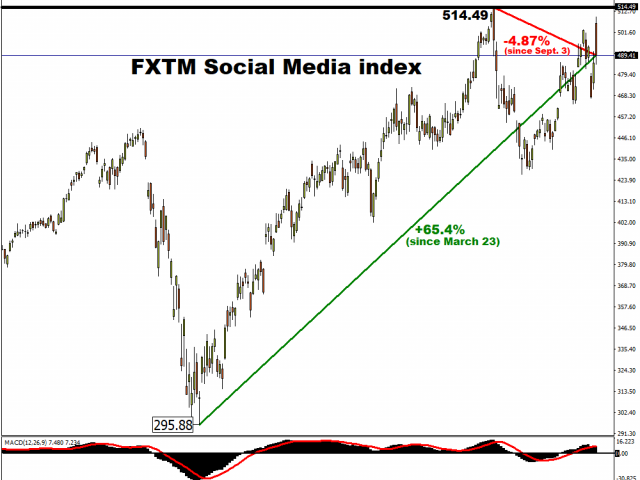 In contrast, the FXTM Social Media Index is less than five percent below its record high, given its concentration on pandemic-era winners. Shares in Alphabet, Google’s parent company, climbed nearly seven percent over the last two trading sessions of October, combined, after reporting better-than-expected Q3 earnings last week. Google’s 25 percent weightage on the FXTM Social Media Index helped to offset the declines in its other three constituents, namely Facebook, Twitter, and Snapchat.