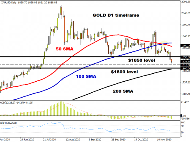 The primary culprits behind Gold’s sharp decline revolved around the better-than-expected U.S business activity data and rising optimism over the progress in a Covid-19 vaccine. Appetite towards the safe-haven asset took another hit amid the triggering of a formal transition process to President-elect Joe Biden. With Biden set to nominate former Federal Reserve Chair Janet Yellen to become the next Treasury secretary, this may boost the prospects for further fiscal and monetary stimulus given her reputation as a dove. Such a move has been welcomed by investors, with the risk-on sentiment further pressuring Gold which has weakened over 2% since the start of the week.