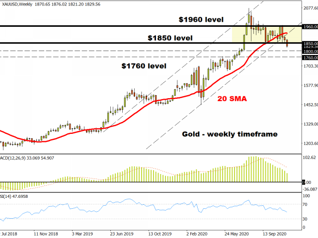 Zooming out to the weekly timeframe, a solid close below the $1850 could signal the start of a bearish trend. Prices are already trading below the 20 SMA while the MACD is displaying early signs of crossing to the downside. Should bears keep prices below $1850 this week, previous support could transform into a dynamic resistance that encourages a decline towards $1800 and $1760.