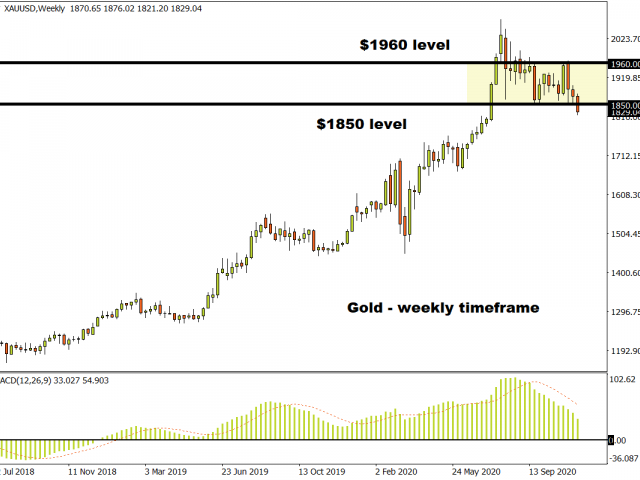 After being trapped within a wide range for many weeks, Gold has finally broken below the stubborn $1850 support level.