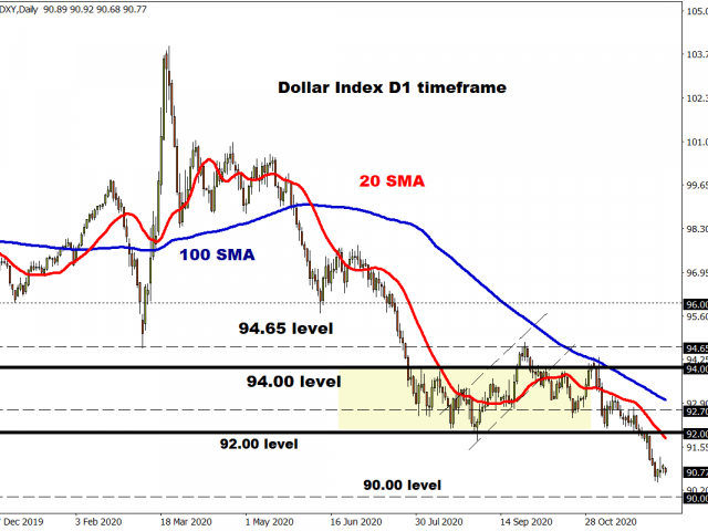 Across the Atlantic, the latest US inflation figures will be in focus on Thursday. Inflation is forecast to cool 1.1% from 1.2% in October while core inflation is expected to remain unchanged at 1.6%. Taking a quick look at the Dollar Index, bears remain in control with sustained weakness below 91.00 opening a path towards 90.00.