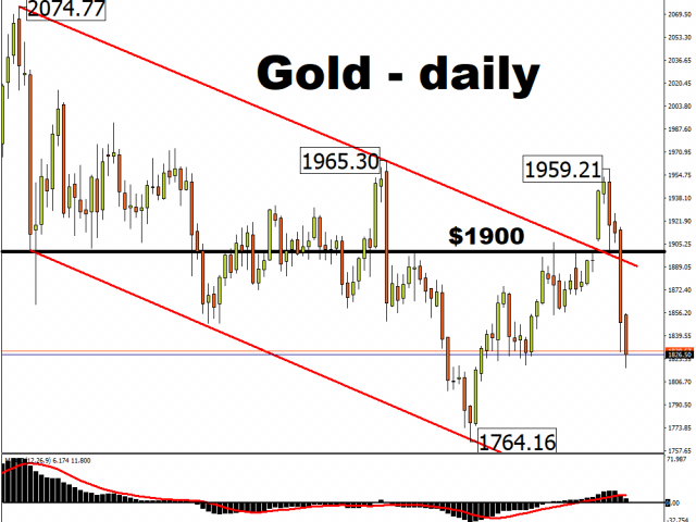 Considering that 10-year US Treasury yields are already at their highest levels since March, the mere hint of a pullback in the Fed’s asset purchasing programme could trigger another yields spike, which could come at the expense of the non-yielding Gold.