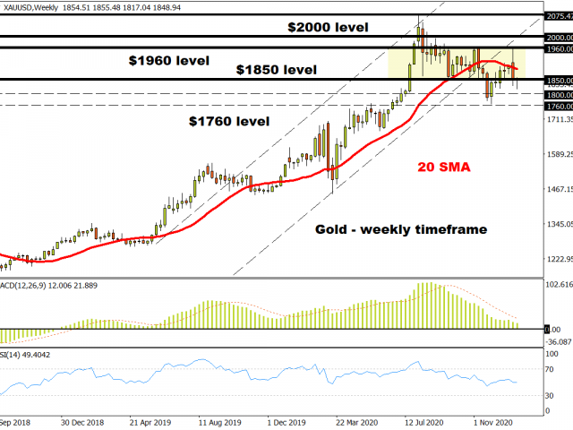 On the weekly timeframe, prices remain a very wide range with tough support around $1760 and resistance around $1960. A strong move back above $1850 could open the doors back towards $1900 while a breakdown below $1800 could signal a decline towards $1760.