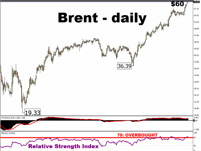Brent oil is tantalisingly close to the psychologically-important $60/bbl level, which is well within reach. Still, from a technical perspective, its 14-day relative strength index indicates that it has reached overbought levels, and may be ripe for a pullback.