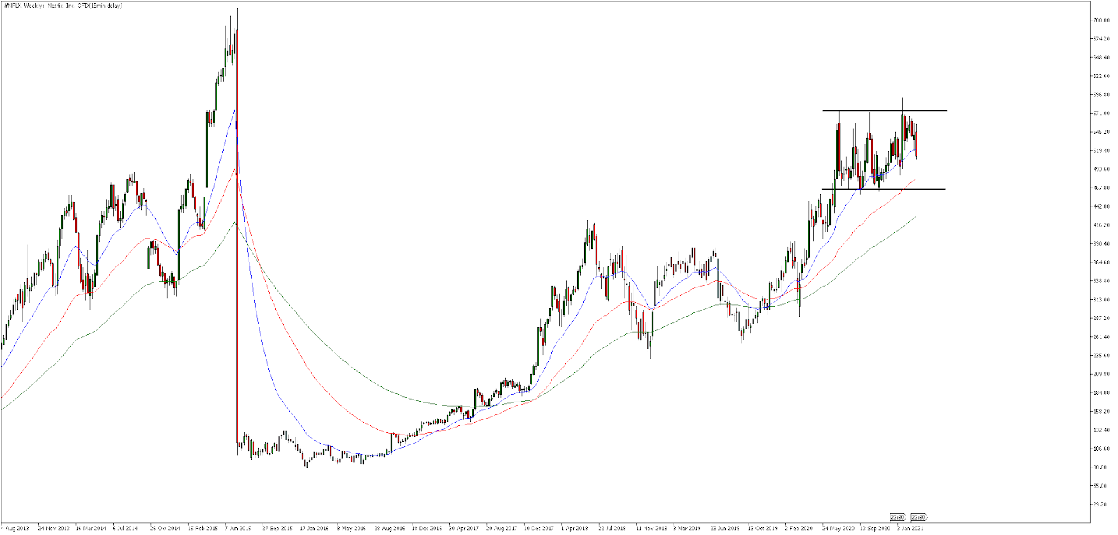 Over the past several weeks we have seen a rotation out of high-flying tech stocks and into undervalued industrials. The long-term, weekly chart below shows the rally higher in Netflix’s share price before entering a trading range towards the end of 2020 which it is still in.