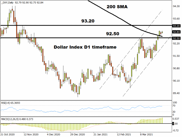 The dollar has entered the week on a firm note, appreciating against every single G10 currency excluding the Japanese yen. Enthusiasm over the US economic recovery and rising Treasury yields have pushed investors towards the dollar’s safe embrace, while progress on the vaccine front has sweetened appetite for the currency. Given how the euro has been punished by spiking coronavirus cases in Europe and its faltering vaccination campaign, this could push the Dollar Index higher – especially when considering the euro’s weighing.