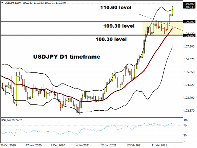 We delved into the technical set up in USD/JPY this morning and this is always a key currency pair to look at when bond yields are moving north. Tomorrow is the end of the Japanese financial year and our target of 110.60 in USD/JPY is getting very close already. If the pair can hold and close up here, then the next level is a few big figures away. However, 110 is the approximate top of the broad descending channel going back to the end of 2016 and momentum indicators are heavily overbought on the daily charts so this pair could be due a pullback soon.
