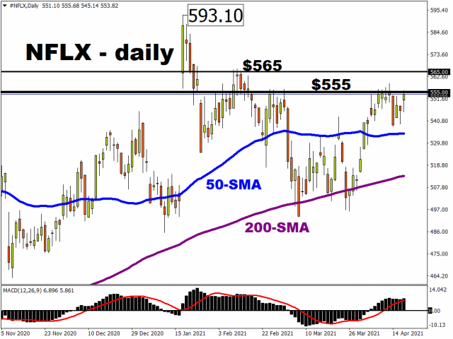 From a technical perspective, Netflix’s share prices found support at its 200-day simple moving average (SMA) in March, using it as a platform to launch back above its 50-SMA this month. However, with the bullish momentum in the stock plateauing, while a close above the $555 mark having proved hard to come by since mid-February, Netflix could do with a positive catalyst to catch up with the rest of its peers.
