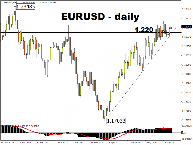 With next week’s ECB meeting looming, EURUSD has struggled to firm above 1.22 convincingly, with two attempts last week failing to hold. However, Friday’s price action was more constructive with lower prices being snapped up by buyers and printing a bullish hammer candlestick. The ISM manufacturing report out of the US is also released later, which is set to rise a bit from an already high level.