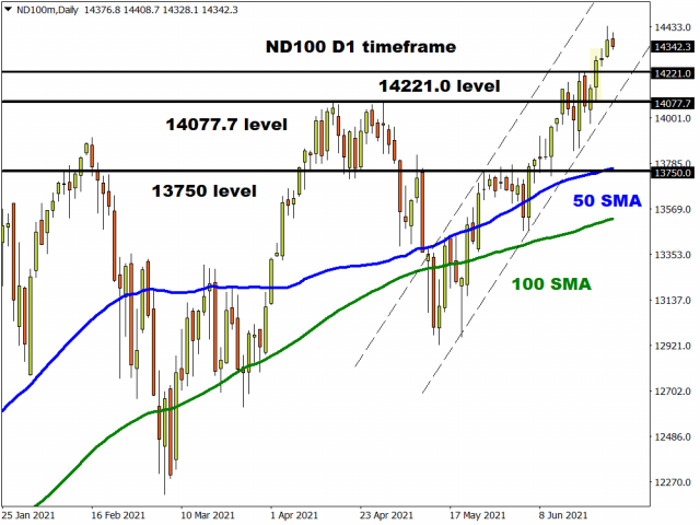 On Tuesday evening, Chair Jerome Powell struck a more cautious tone during his testimony before the House Select Subcommittee on the Coronavirus Crises. Powell reiterated the view that higher inflation would be transitory and how the Fed was nowhere near hiking interest rates. Equity bulls rejoiced on this dovish rhetoric with the Nasdaq rallying to fresh record highs.