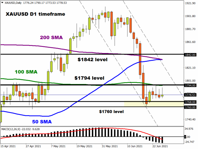 Let’s not forget about gold. The precious metal has struggled to nurse the deep wounds inflicted from last week’s brutal selloff. Gold remains trapped within a range with support around $1760-$1768 and resistance at $1794 which is where the 100-day Simple Average resides. A breakout could be on the horizon.