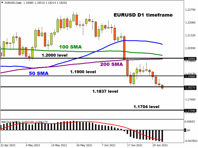 EUR/USD is already moving this morning breaking through the 76% retracement of the end of March to May move at 1.1837. If this break holds, the door is open for a full retracement to the 1.1704 area. But the pair is oversold on the daily RSI and this has acted as a rebound point in the recent past. Prices would need to get up beyond 1.19 to slow the bearish momentum as we head into the 4th of July Independence Day Holiday.