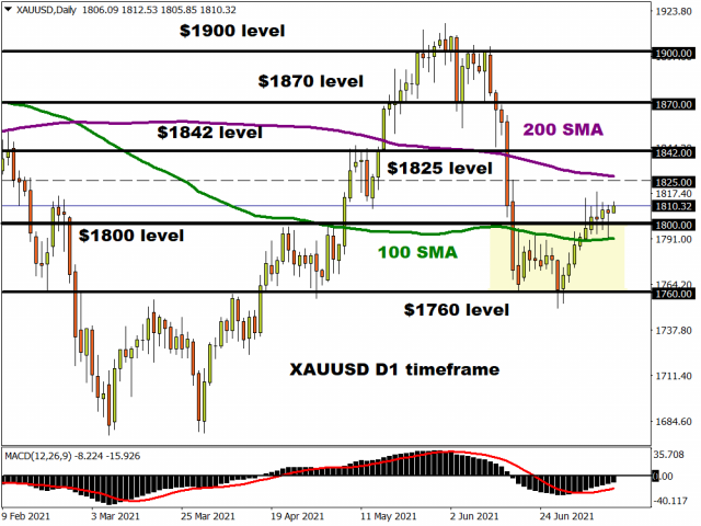 Despite the weekly close above $1800, bulls are certainly not out of the woods yet. Gold bugs may face resistance around $1825 as this is where 200-day SMA resides. However, if this zone can be overcome, the next key levels of interest can be found at $1842, $1870 and $1900. Alternatively, a breakdown below $1800 could signal a decline back towards $1760.