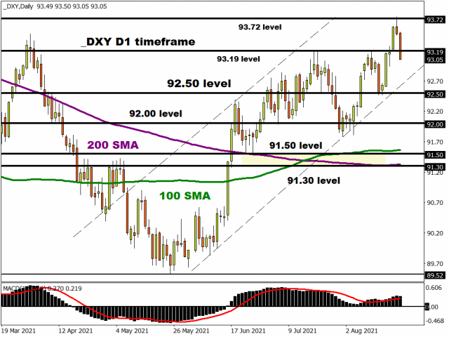 The dollar has reversed some of its recent gains but still remains elevated. The DXY has fallen below the previous July top at 93.19 after making a 10-month high at 93.72 at the end of last week. The move lower was kicked off by comments from the Fed’s Kaplan on Friday who suggested he might change his call for early Fed tapering if the Delta variant started damaging US growth. He is known as one of the more hawkish Fed members.