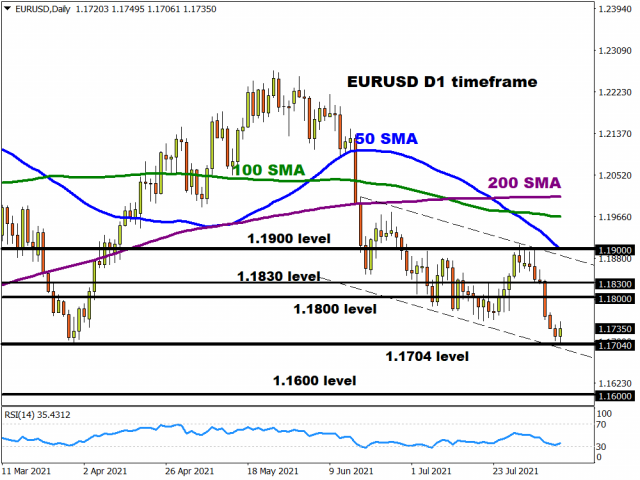 EUR/USD had closed lower for six straight days until today and moved down to test the year-to-date lows at 1.1704. Oversold conditions on the RSI are seeing some buying in the pair, but longer-term the relative position for both central banks is still exceptionally wide.