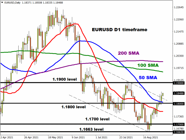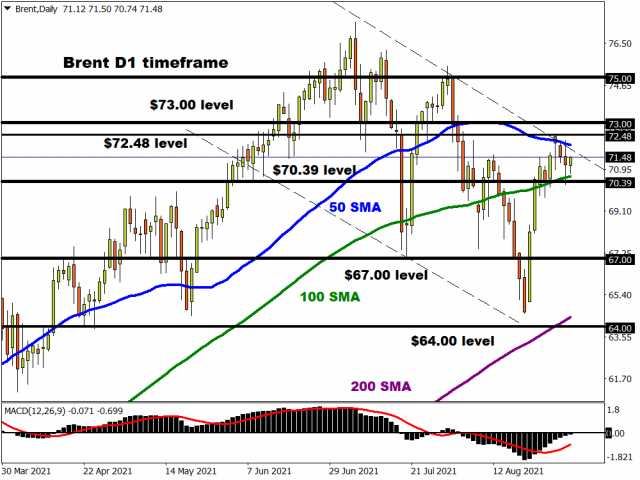 The meeting’s outcome had little effect on oil prices as it was widely expected. Prices popped above $73 on Hurricane Ida, but we are now currently trading back at the 50% retracement level of the July-August drop at $70.39 where the 100-day moving average also resides. The 50-day moving average has capped price rises so far at $72.48.