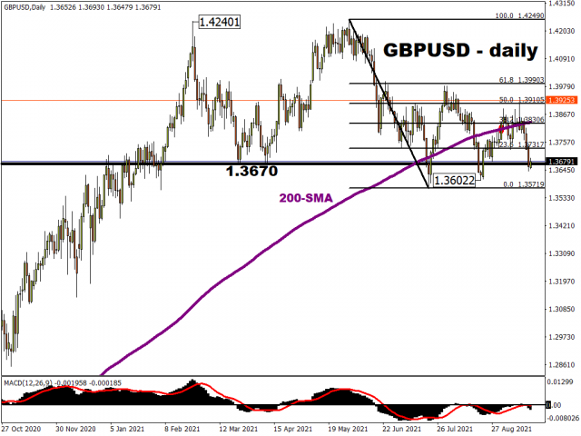 The currency pair known as ‘cable’ is currently testing a key support region around 1.3670, which had held resolute in March and April this year. Failure to hold could see immediate support at August’s low of 1.36022, followed by 1.35719 which was the lowest point in cable’s summer declines.