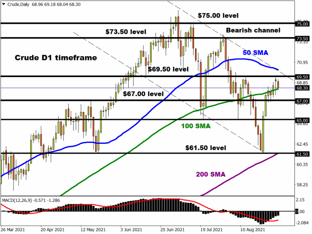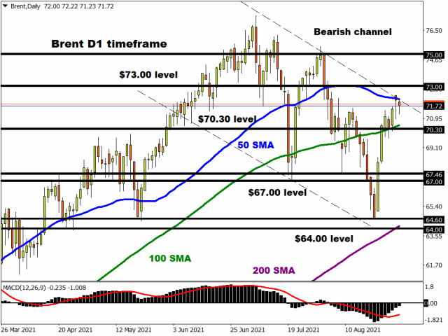 Taking a look at the technical picture, Brent crude remains in a bearish channel on the daily charts. Despite the sharp rebound witnessed last week, the commodity is still on route to concluding August roughly 4.6% lower. The recent candlesticks on the daily charts suggest that bulls could be exhausted with sustained weakness below $73 triggering a decline back towards $70.30 – a level where the 100-day Simple Moving Average resides. A break below this point could see Brent sink towards $67.46, $67 and $64.60, respectively. Alternatively, a solid daily close above $73 may pave a path towards $75 and potentially higher.