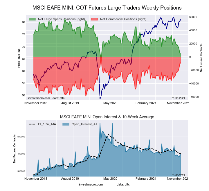The MSCI EAFE Mini large speculator standing this week equaled a net position of 4,194 contracts in the data reported through Tuesday. This was a weekly fall of -1,581 contracts from the previous week which had a total of 5,775 net contracts.