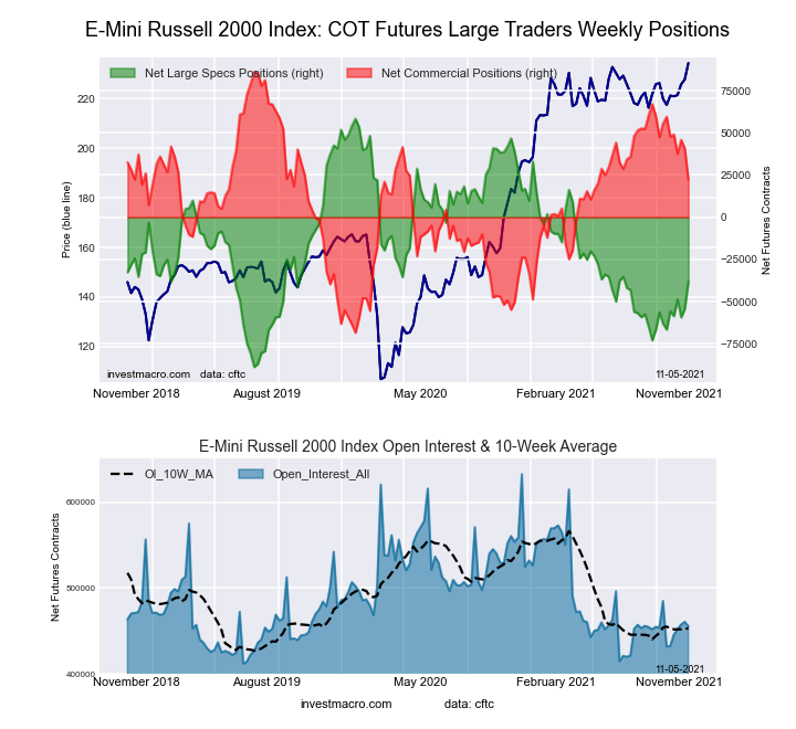 The Russell 2000 Mini large speculator standing this week equaled a net position of -38,171 contracts in the data reported through Tuesday. This was a weekly boost of 16,260 contracts from the previous week which had a total of -54,431 net contracts.