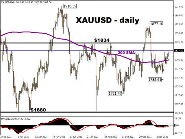 Amid the quiet trade, gold is creeping north with four straight days of gains. Prices had been trading around the 200-day simple moving average around $1800 but the recent move has pushed up making one-month highs. Strong resistance again sits at $1834 ahead of recent cycle highs above $1870.