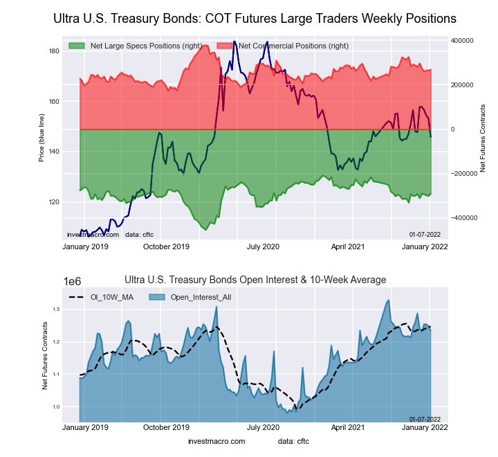 The Ultra 10-Year Notes large speculator standing this week resulted in a net position of 96,605 contracts in the data reported through Tuesday. This was a weekly fall of -17,211 contracts from the previous week which had a total of 113,816 net contracts.
