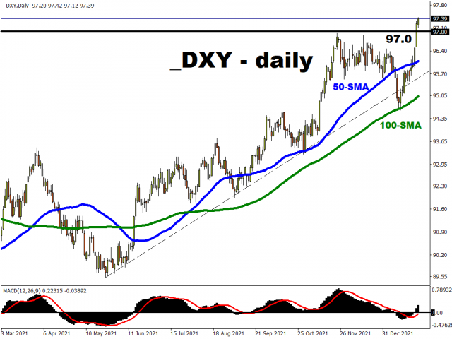 The DXY index crossed above the previous high at 96.94, with a resistance zone standing at 97.72 which is the 61.8% Fib retracement level of the 2020 dollar slide and the June 2020 high at 97.80.