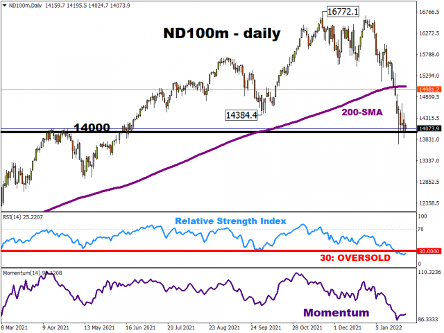 Technically, momentum had looked very bearish once the index plunged through the 200-day simple moving average just above 15,000. Monday’s collapse and then reversal was a sight to behold, and the long-legged wick on the daily candlestick may tell us that a bottom is in place at 13,724. Buyers were able to push prices into the green on the close and above the previous April 2021 high at 14,073. The index has consolidated between here and the October bottom at 14,384.4 in recent sessions so the weekly close will be hugely significant for medium-term direction.