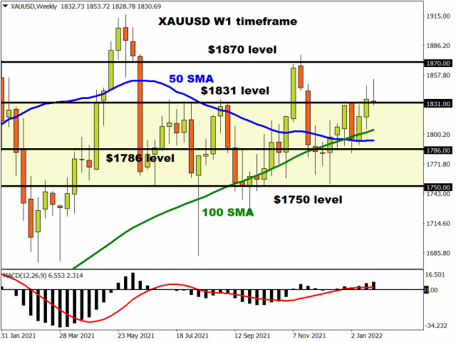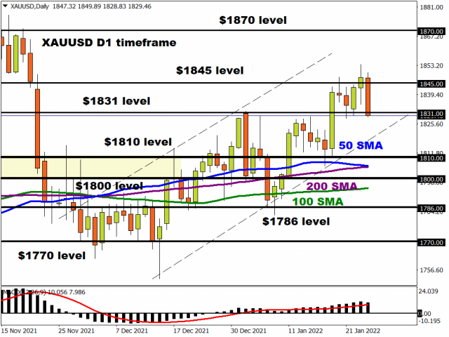 Markets widely expect the Fed to leave interest rates unchanged in January. However, investors will closely scrutinise the meeting for fresh insight into the Fed’s aggressive monetary policy path for 2022. Should Fed hawks dominate the scene, this could hit buying sentiment towards gold with prices sinking back towards $1810 and $1800 in the short term. A strong daily close below the psychological $1800 level could open the doors towards$1786.