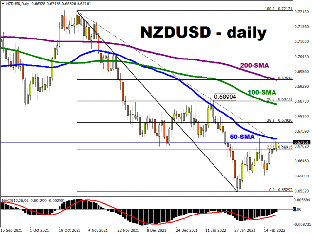 Risk sentiment will need to change heavily with the Ukraine crisis pointing to de-escalation, or the RBNZ surprise with a bigger rate move, to extend the bounce in the kiwi.