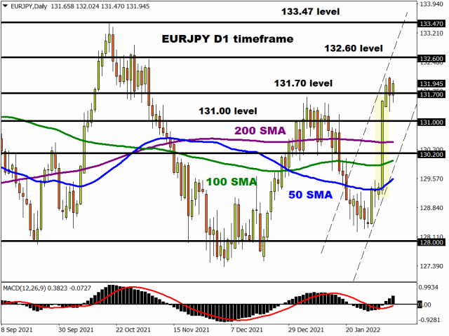 A hawkish ECB tipped the balance between the EUR and JPY with bulls going out of control. Prices are trading around the 132.00 level of writing with further upside certainly on the cards. A strong daily close above 131.70 could encourage a move towards 132.60 and 133.47. Technical indicators such as the Simple Moving Average and MACD agree with the bullish outlook. Should 131.70 prove to be unreliable support, a decline back towards 131.00 and 130.20 could become reality.