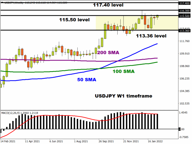 The story changes on the weekly charts. Prices remain in a wide range with support around 113.360 and resistance at 115.50. A solid weekly close above this resistance could trigger an incline towards 116.30 and 117.40. Alternatively, a rejection from 115.50 could inspire a selloff towards 114.50, 114.00, and 113.360.