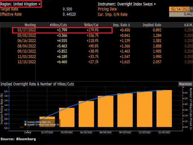 Pound bulls continue to draw strength from improving economic data and BoE rate hike expectations. A rate hike for March has already been priced in with traders expecting the central bank to raise interest rates 6 times in 2022.