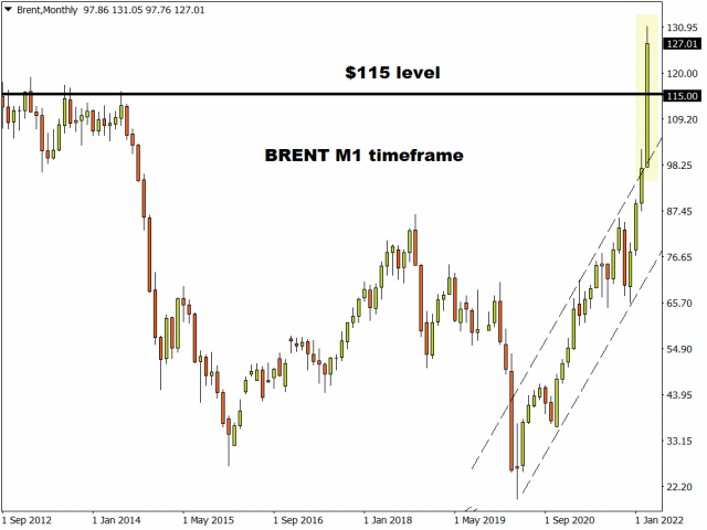 Oil’s explosive momentum on the monthly timeframe resembles a speeding train reaching maximum velocity with geopolitics keeping the engines running at maximum capacity. Things are looking incredibly bullish with the first key level of interest being the all-time high at $147.50. A breakout above this level will open the doors to uncharted territories. If the upside momentum runs out of steam, a decline back towards $115 could be on the cards.