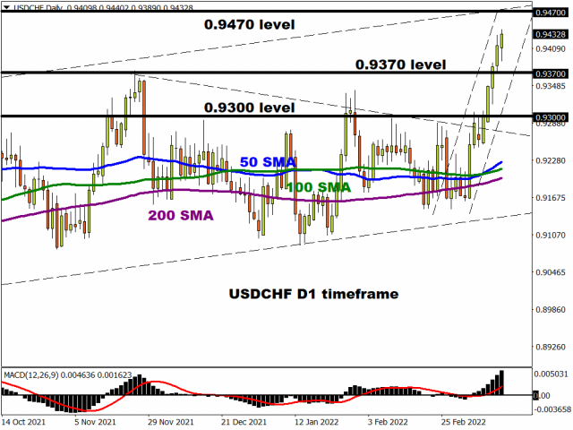 A chart can say 1000 words. Taking a look at the USDCHF, bulls are clearly in control and are eyeing 0.9470. Beyond this level, key points of interest can be found at 0.9500 and 0.9620. Should 0.9470 prove to be reliable resistance, prices could slip back towards 0.9370 and 0.9300.