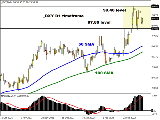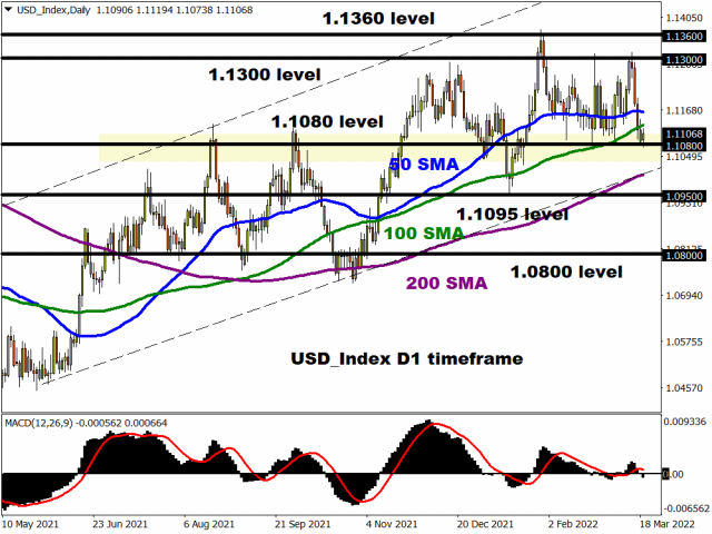 The mighty dollar’s failure to rally on a hawkish Federal Reserve and updated “dot plot” that signalled another 6 rate hikes in 2022 points to signs of exhaustion for bulls. Given how the latest war-related headlines failed to cushion downside losses, bears could be lurking and ready to pounce down the road.