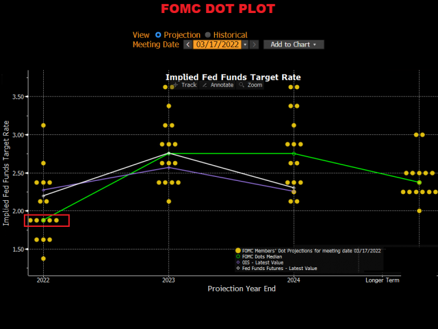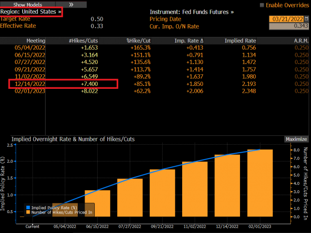 According to Bloomberg’s world interest rate probability model, markets have priced in 7 rates hikes this year.