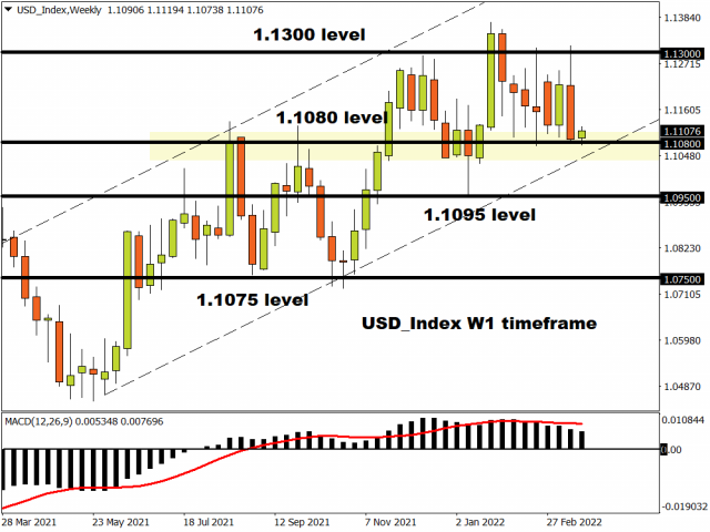 Looking at the equally-weighted USD Index, prices are wobbling above major support at 1.1080 on the weekly charts.