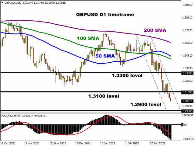We see a similar story on the daily charts with prices respecting a bearish channel. The candlesticks are trading way below the 50, 100, 200-day Simple Moving Average while the MACD trades below zero. The first level of interest can be found at 1.2900. A move back above 1.3100 could trigger an incline towards 1.3300.