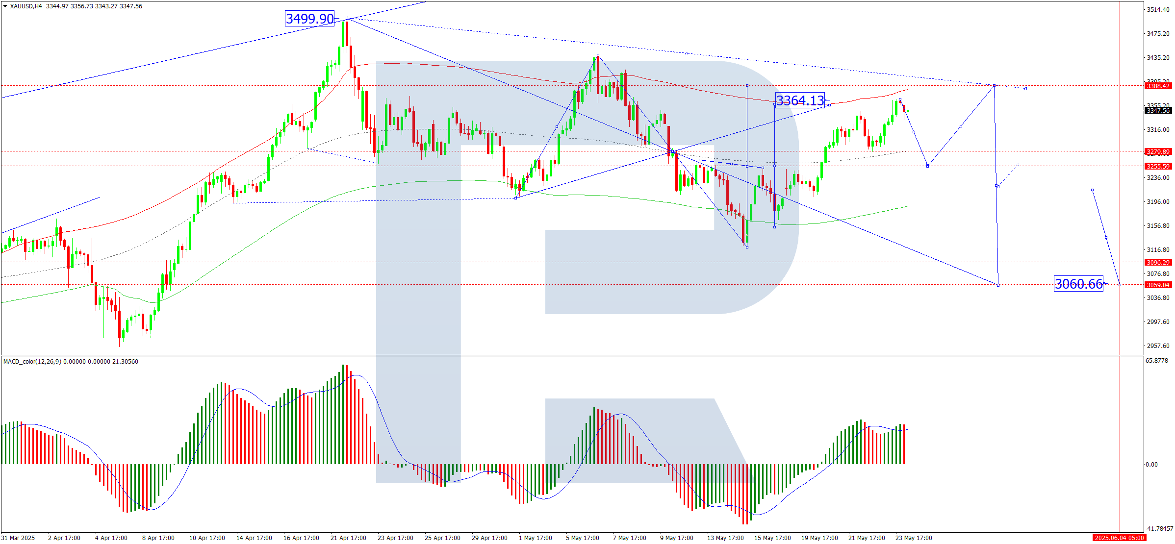 On the H4 chart, XAU/USD found support at 3,280 before rallying to 3,364. A corrective pullback towards 3,255 is possible today, followed by a potential upward move to 3,388. This scenario is supported by the MACD indicator, whose signal line has exited the histogram zone and is now pointing decisively downward.