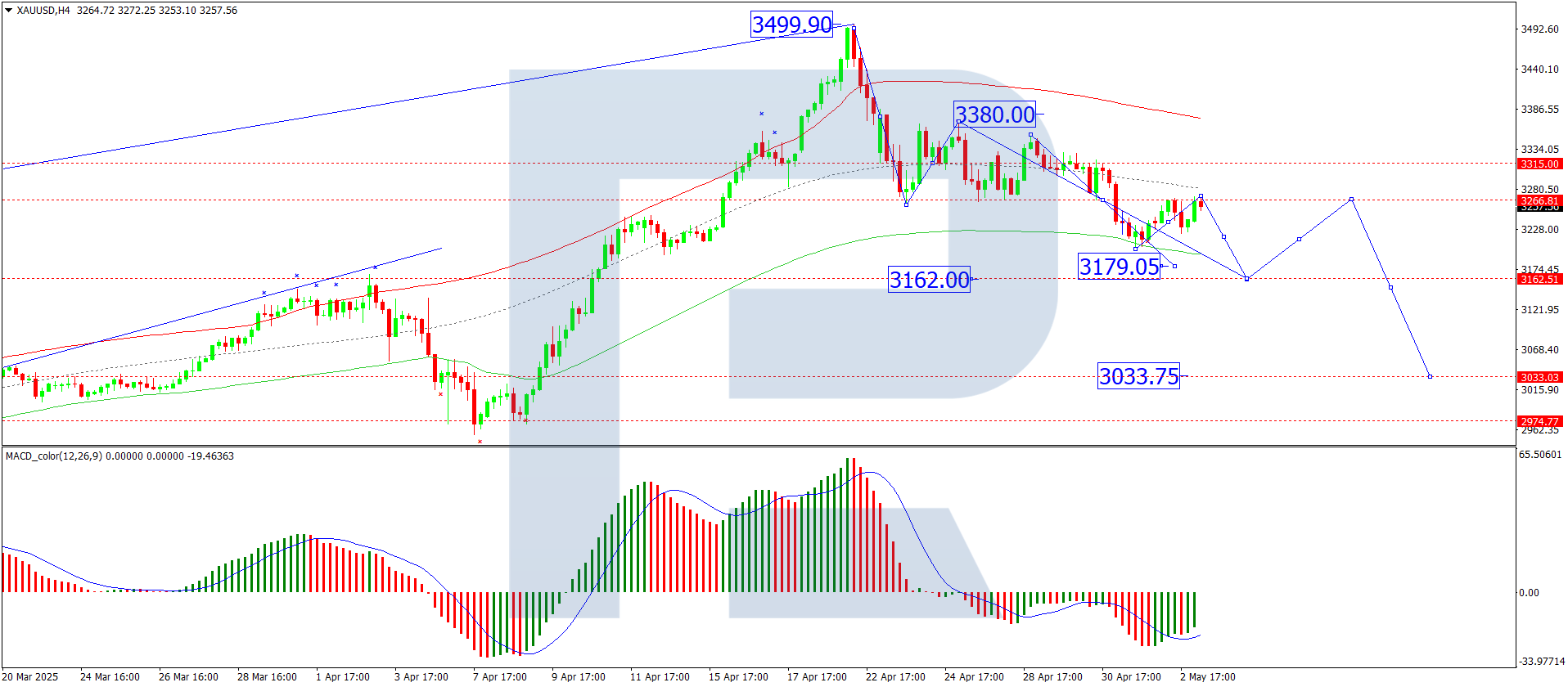 On the H4 chart, XAU/USD is consolidating around 3,266 USD. A decline to 3,165 USD is possible in the short term. After reaching this level, the market may correct back up to 3,266 USD. If the correction completes, another downward wave could unfold with a target at 3,033 USD. The MACD indicator supports this bearish scenario, with its signal line below zero and pointing sharply downwards.