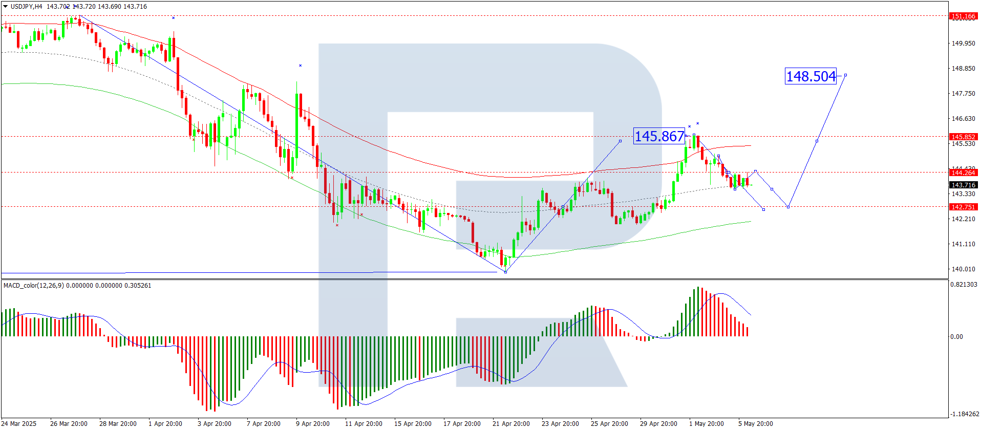 On the H4 chart, USD/JPY completed a growth wave towards 145.86, followed by the start of a corrective phase. The first downward impulse reached 143.72, followed by a correction to 145.05. The market is now forming a consolidation range around 144.30. A downward breakout from this range could send the pair to 142.75. The MACD indicator supports this scenario, as its signal line has exited the histogram area and points firmly downwards, suggesting continued bearish pressure.