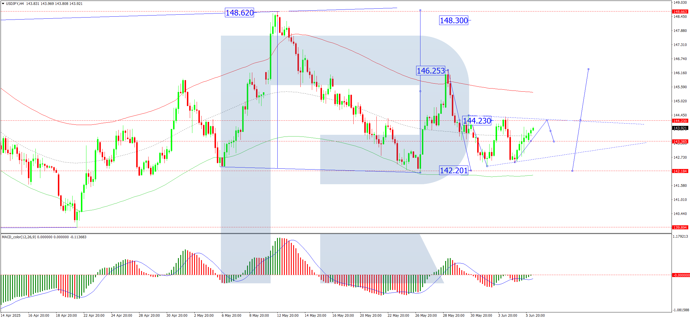 On the H4 chart, USD/JPY continues to consolidate around 143.33. The current move is heading towards 144.23. A downward breakout from this range would pave the way for a decline to 142.20, with a possible extension to 140.50. Conversely, an upward breakout could trigger a bullish move towards 146.25. The MACD indicator supports this scenario, with its signal line below zero and pointing sharply upwards, indicating growing bullish potential.