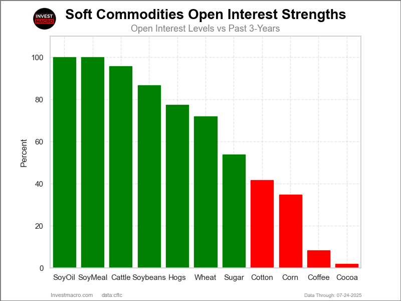 On the downside, Sugar (2 percent), Soybean Meal (5 percent), Cocoa (19 percent) and Corn (18 percent) come in at the lowest strength levels currently and are in Extreme-Bearish territory (below 20 percent).