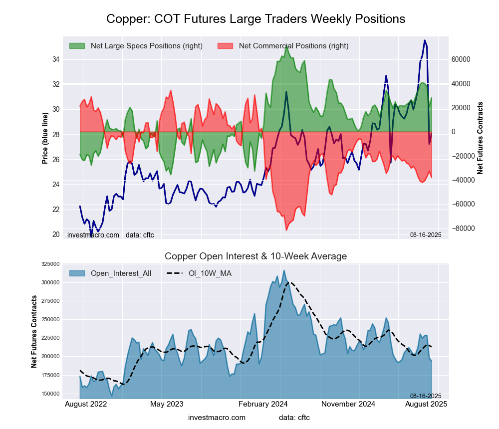 Copper Futures COT ChartThe Copper Grade #1 Futures large speculator standing this week was a net position of 28,211 contracts in the data reported through Tuesday. This was a weekly advance of 7,525 contracts from the previous week which had a total of 20,686 net contracts.